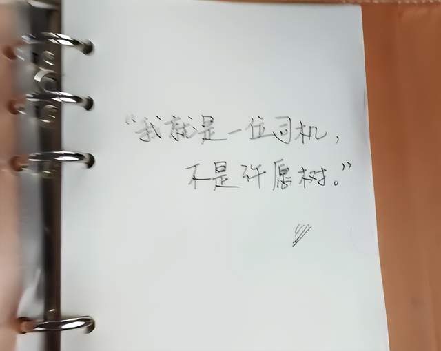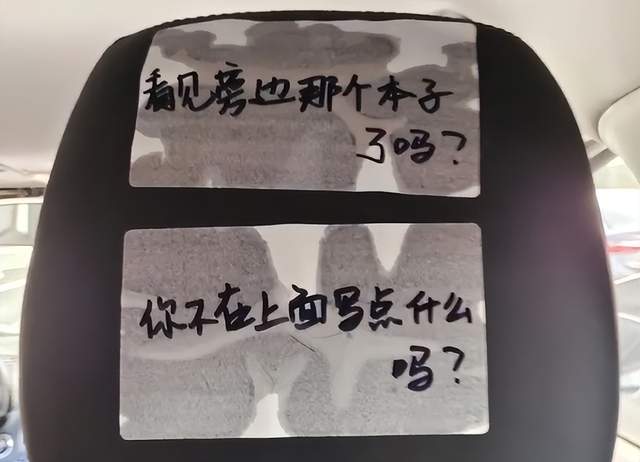男子称,上车后看到副驾的头枕上贴着两行字:“看见旁边那个本子了吗?你不在上面写点什么吗?”,原来主驾驶的头枕上用绳子挂着一个笔记本,本子上面写着“请留一句给下一位乘客的话”。