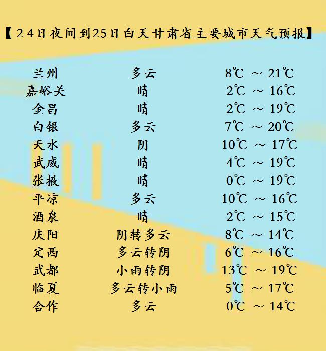 明天夜间到后天白天,甘南、临夏、定西、陇南等州市阴间多云,部分地方有阵雨(雪)或雨夹雪;省内其余地方多云或晴。