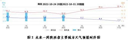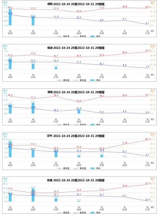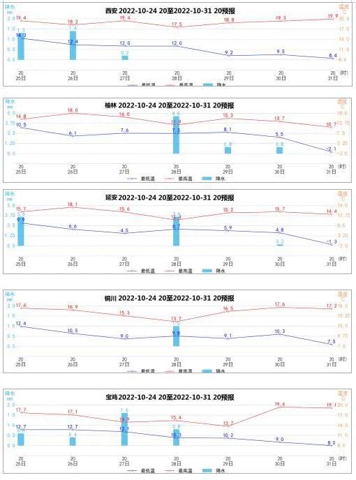 受持续阴雨天气影响,25-29日陕南地区最高气温维持在9~14℃之间。另受弱冷空气影响,31日前后陕北大部日平均气温下降4~6℃,局地可达6~8℃。