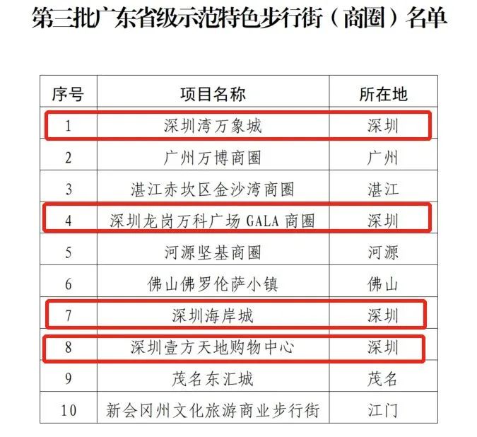 广东省商务厅日前公布了第三批省级示范特色步行街(商圈)认定名单。在公布的10个项目中,深圳占4席。深圳湾万象城、深圳龙岗万科广场GALA商圈、深圳海岸城,以及深圳壹方天地购物中心在列。
