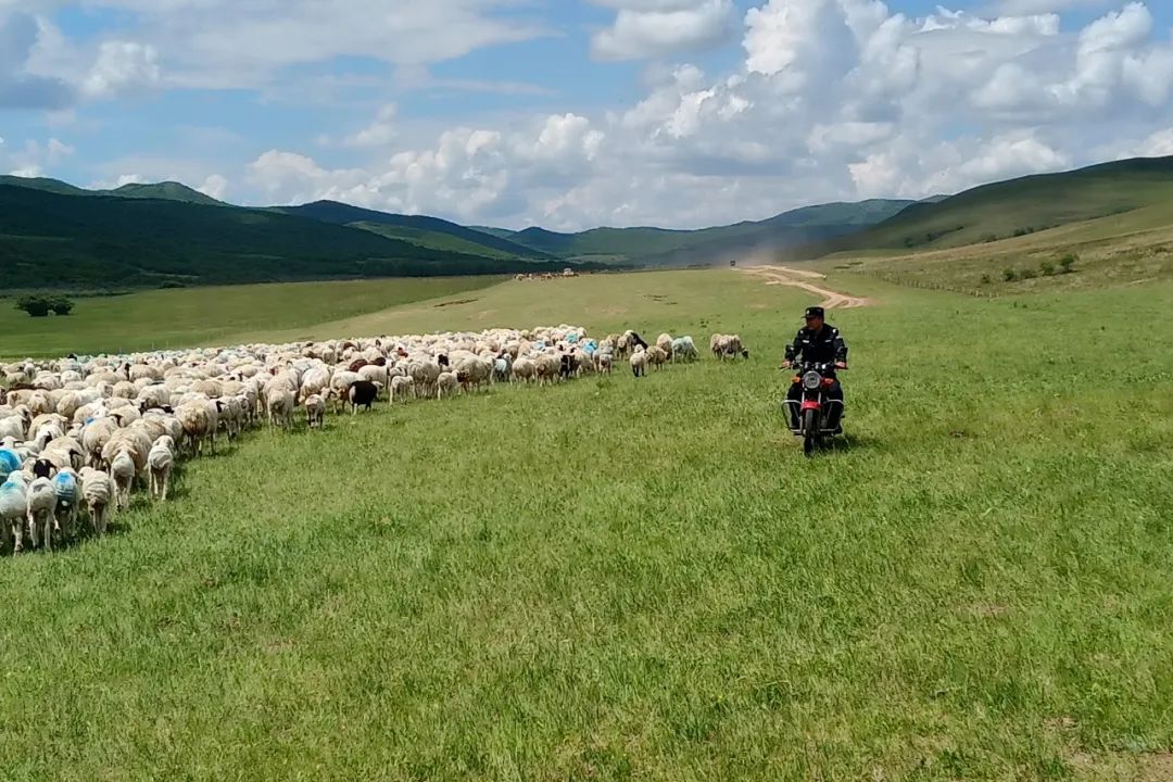 赤峰市阿鲁科尔沁旗巴彦温都尔苏木的牧民们至今恪守着传统的游牧习俗。每当牧民赶着牛羊浩浩荡荡地转场时,总会有民警辅警守护的身影,“藏青蓝”融入广袤草原的苍茫。