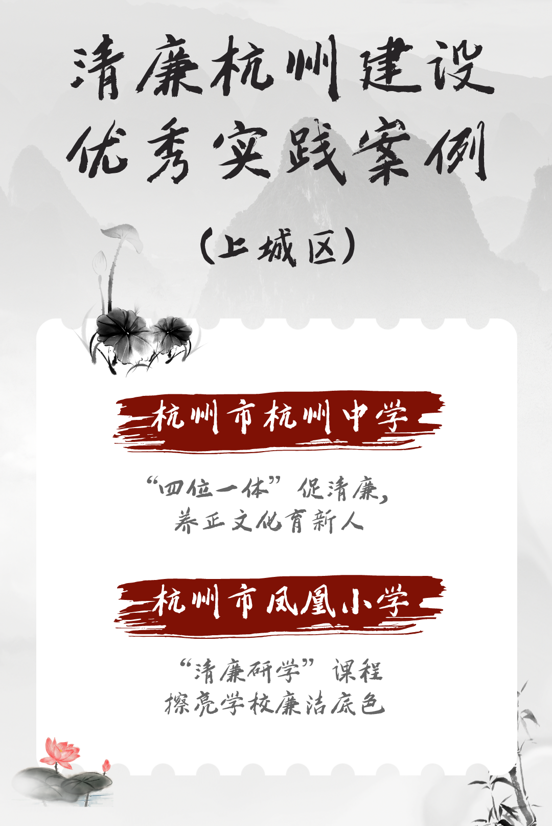 近日,中共杭州市委办公厅公布清廉杭州建设优秀实践案例,杭州市杭州中学、杭州市凤凰小学优秀实践案例入选。