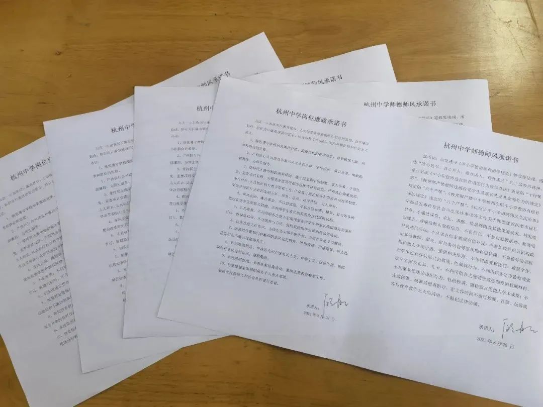 开展以“爱岗敬业、廉洁从教”为主题的师德师风承诺活动;撰写清廉教育故事,弘扬养正精神。在清廉学校建设中,杭州中学坚持让育人者先受教育,将“廉洁从教”的原则贯彻工作始终,充分发挥教师在 “清廉校园”建设中的重要作用。