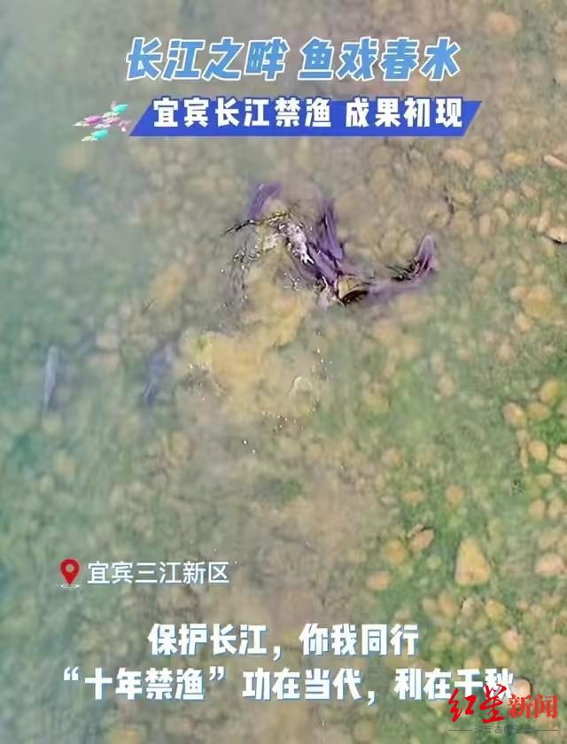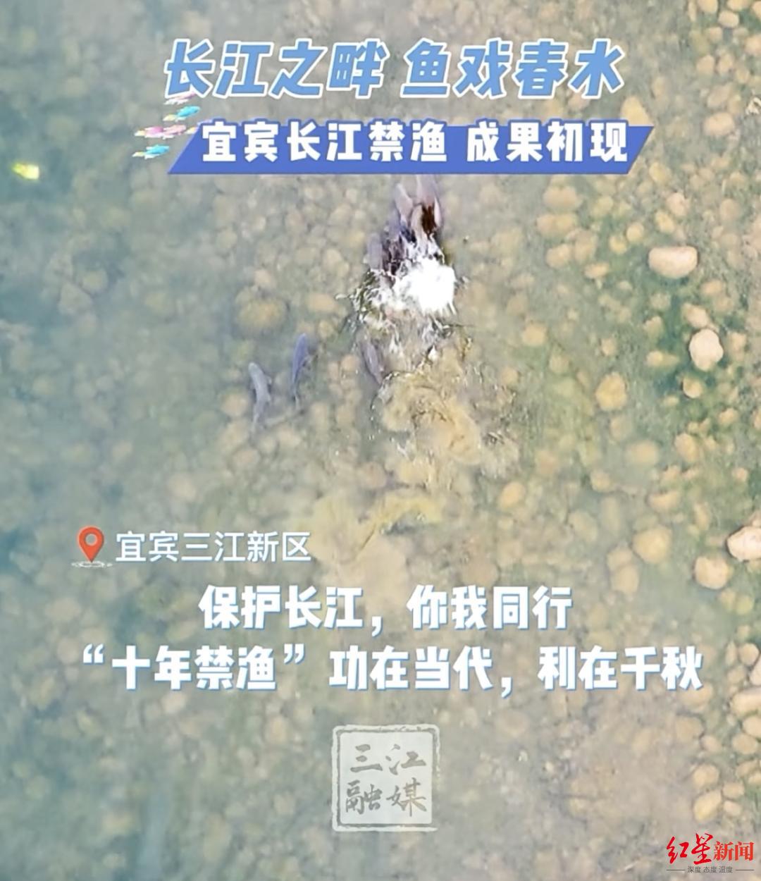 2022年2月,四川宜宾三江新区发布了一段罕见的视频:在长江某处浅滩,摄影爱好者用无人机航拍时,偶然拍到10多条鲤鱼追逐嬉戏,水面泛起朵朵浪花……引来众多网友关注和点赞,至今,这段视频仍为三江融媒视频号上播放量和留言、点赞最多的视频之一。