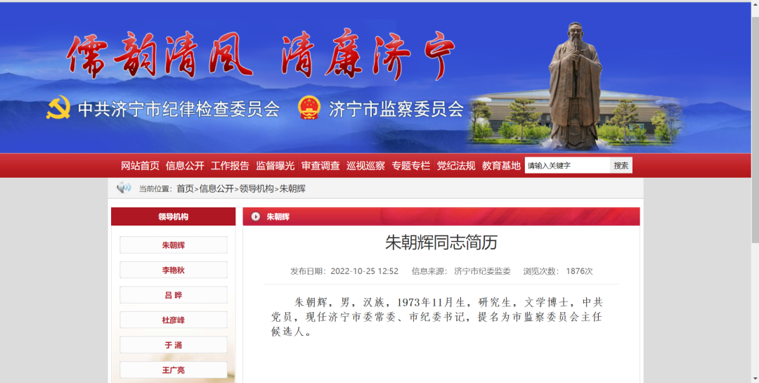 10月25日, 济宁市纪委监委网站更新信息显示,朱朝辉已任济宁市委常委、市纪委书记,提名为市监察委员会主任候选人。