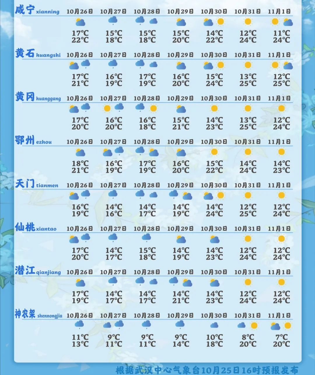鄂西北、鄂西南、江汉平原南部阴天有小到中雨;其他地区阴天有小雨。