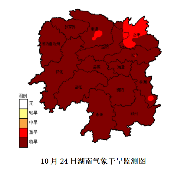 省气候中心最新统计数据显示,全省122个县(市、区)维持重旱以上等级,全省107个县(市、区)为特旱等级。7月21日至10月24日,湖南区域性干旱过程已持续96天,平均影响面积16万平方公里,综合强度达1961年有完整气象纪录以来142次区域性干旱过程中最强。