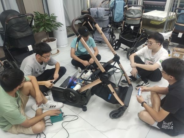 Focus团队的6名队员正围坐在一辆婴儿车旁,让婴儿车实现智能跟随,是企业交给他们的任务。
