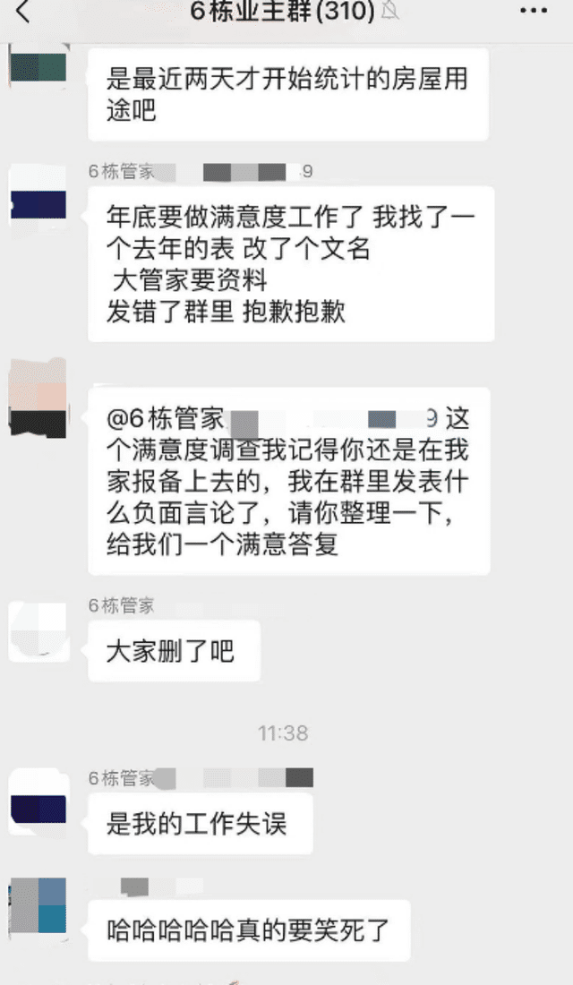 “表格是年底要做的满意度调查,(发生此事)是我的工作失误,这个表格并不是我填写的,可能是之前离职的管家写的。我发错群了,表格本来是要发给大管家的。已经向业主道歉,领导也会给我一个处分,估计要开除。”该管家说。