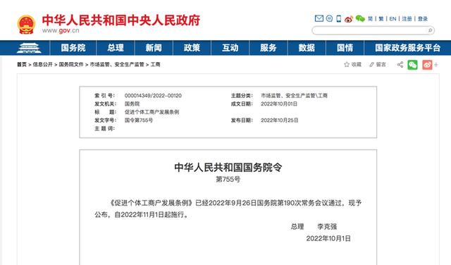 中国政府网10月25日消息,国务院发布《促进个体工商户发展条例》,自2022年11月1日起施行。