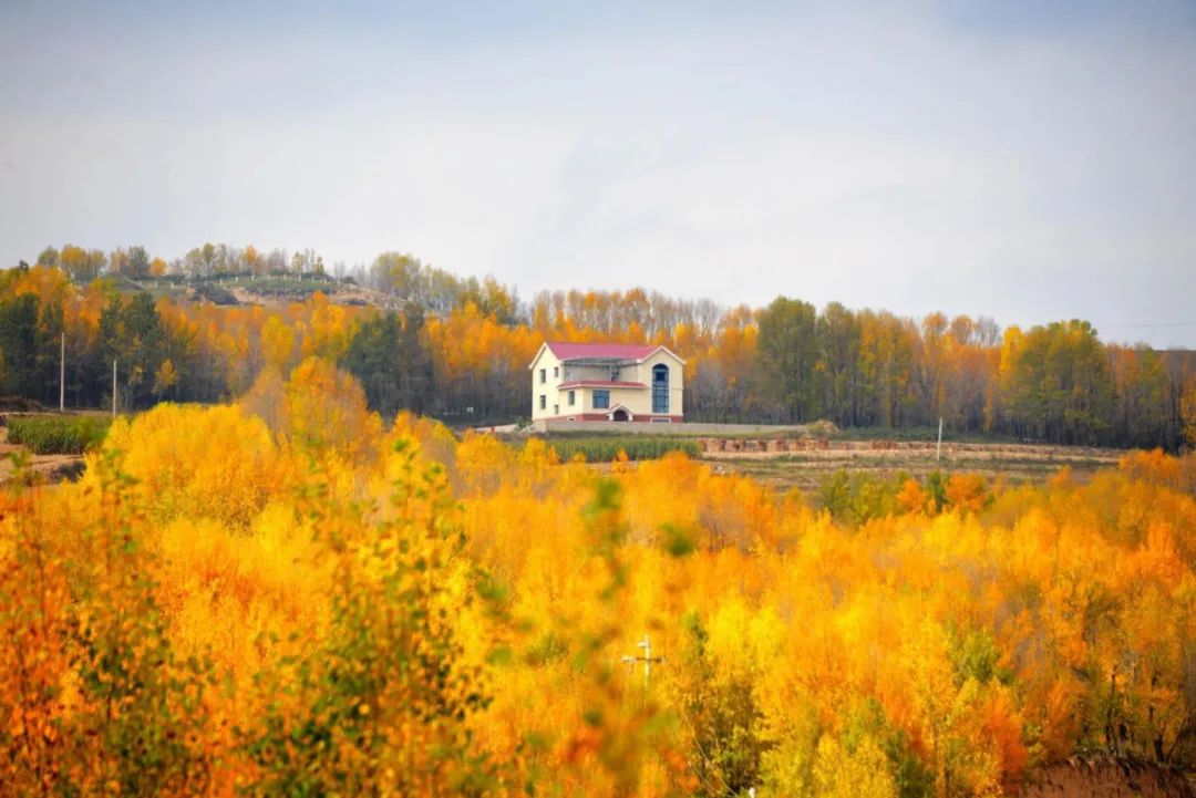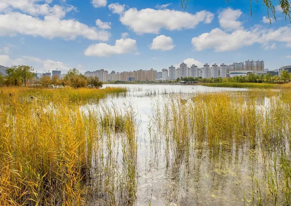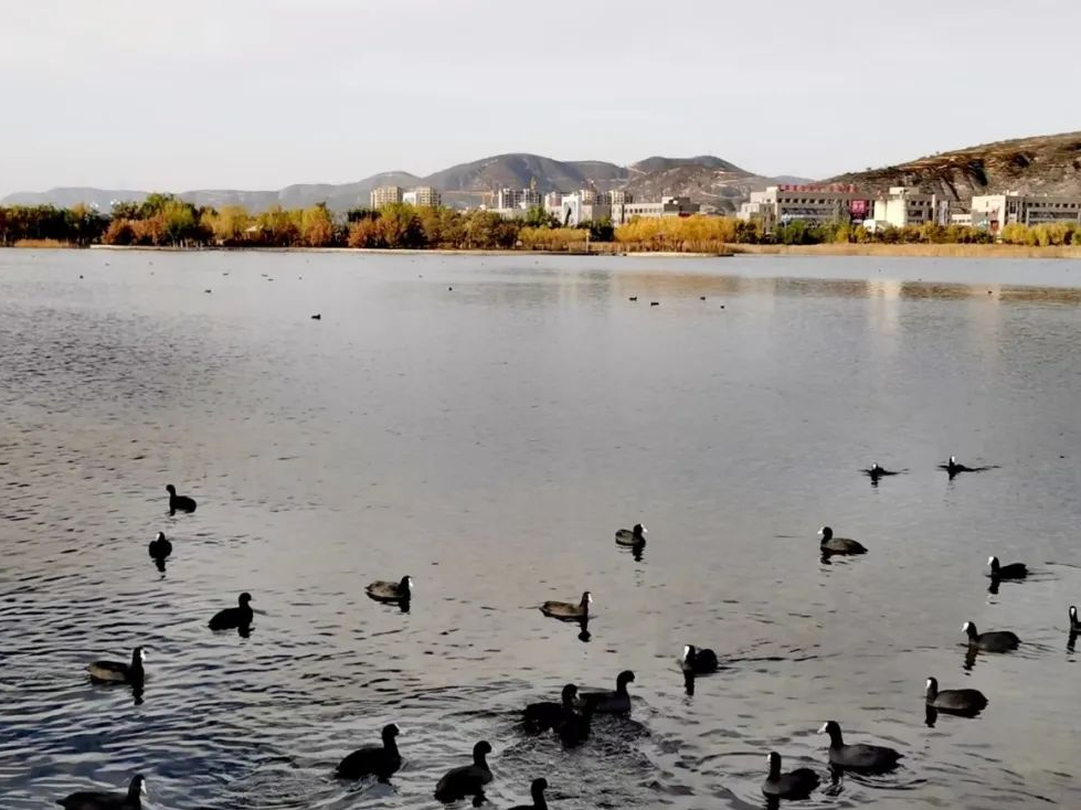 秋色乍染的时光,湖水如镜映秋色,定西湖如诗如画,形成了一幅美不胜收的金秋画卷。