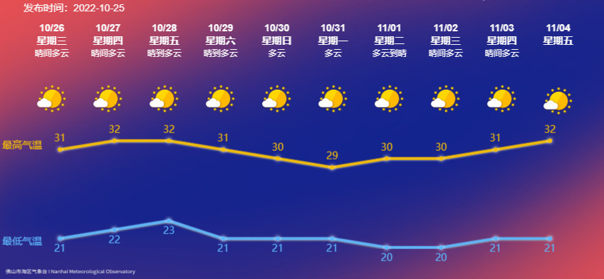 ▶南海区气象局预计,今日白天到夜间:晴间多云,气温21到31度,偏东风2级,相对湿度35%到70%。