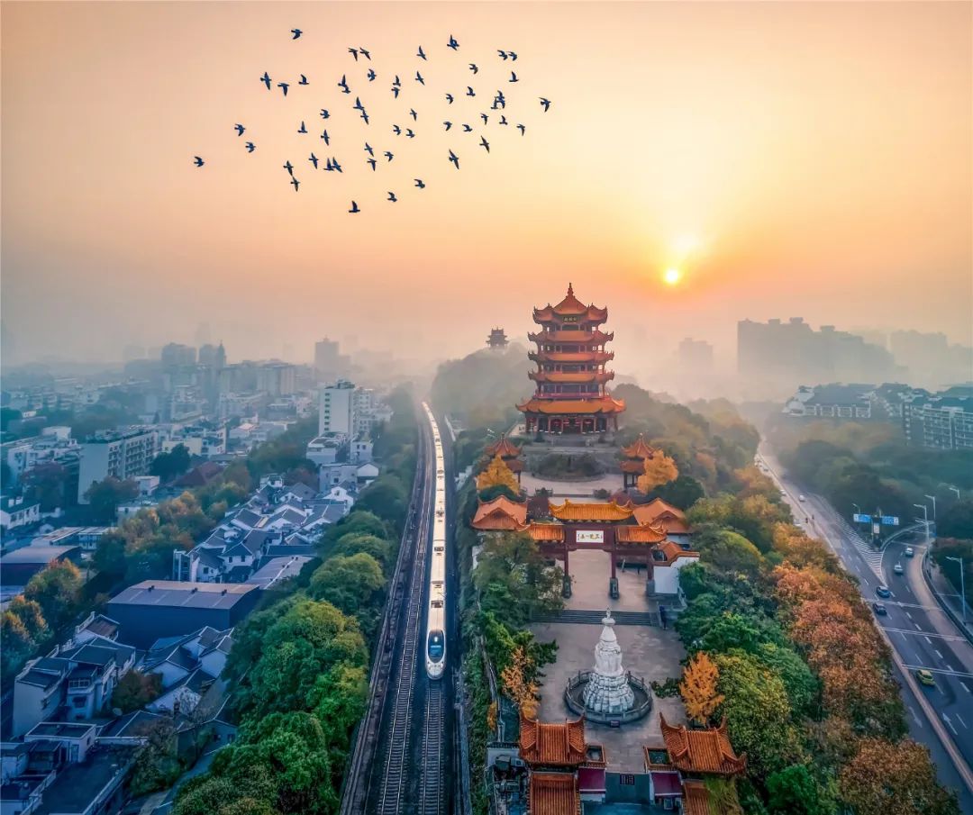 《鸟瞰古城》朝阳喷薄而出,一群飞鸟正掠过黄鹤楼,尽显武昌古城的静谧。城市摄影队汪常青 摄
