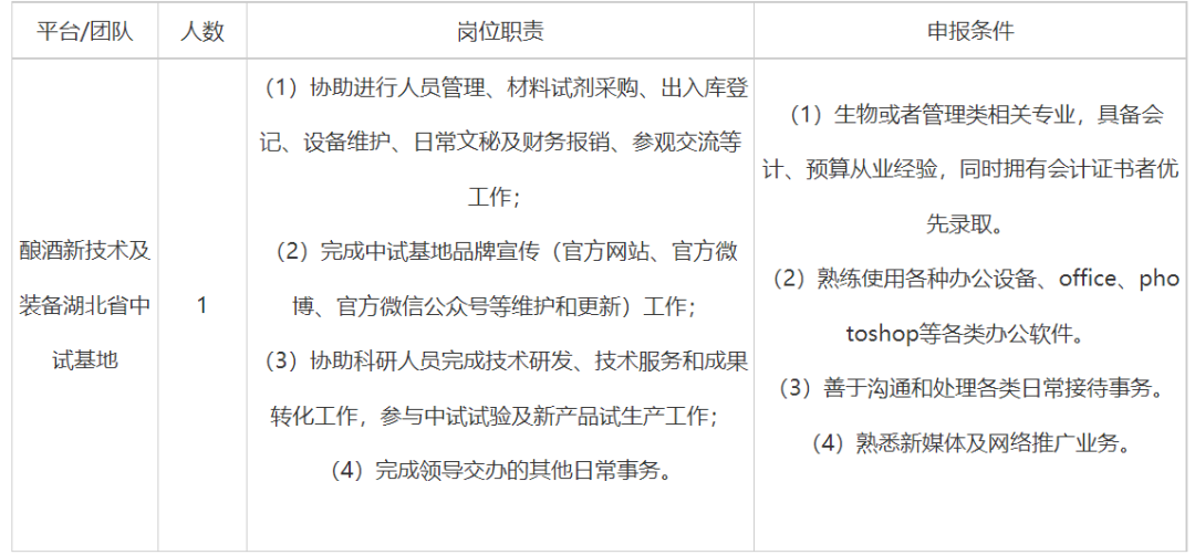 因工作需要,生物工程与食品学院酿酒新技术及装备湖北省中试基地现面向社会招聘科研助理1名,主要从事预算编制与执行、日常文秘及财务报销、科研项目辅助研究、参与中试生产试验、协助成果转化及中试基地品牌推广等相关工作。