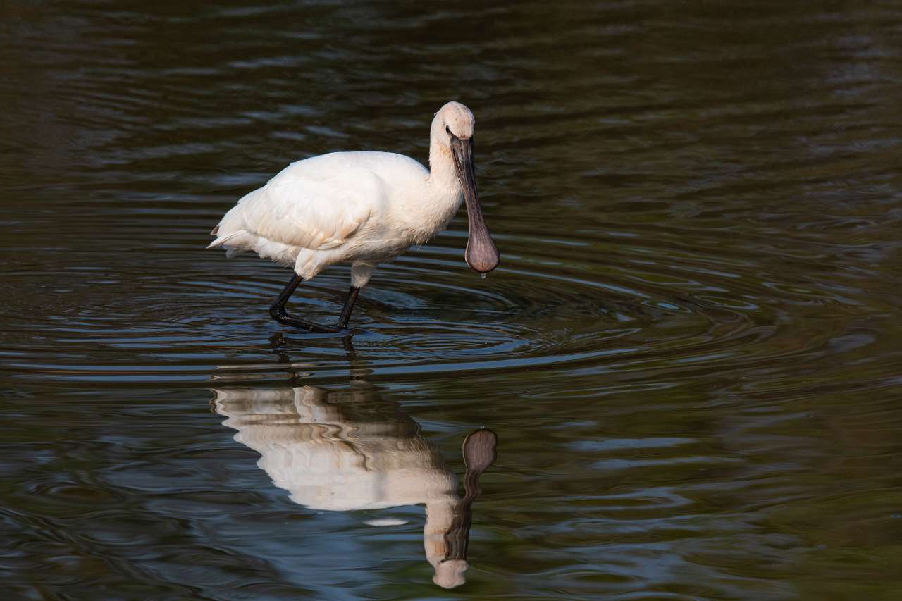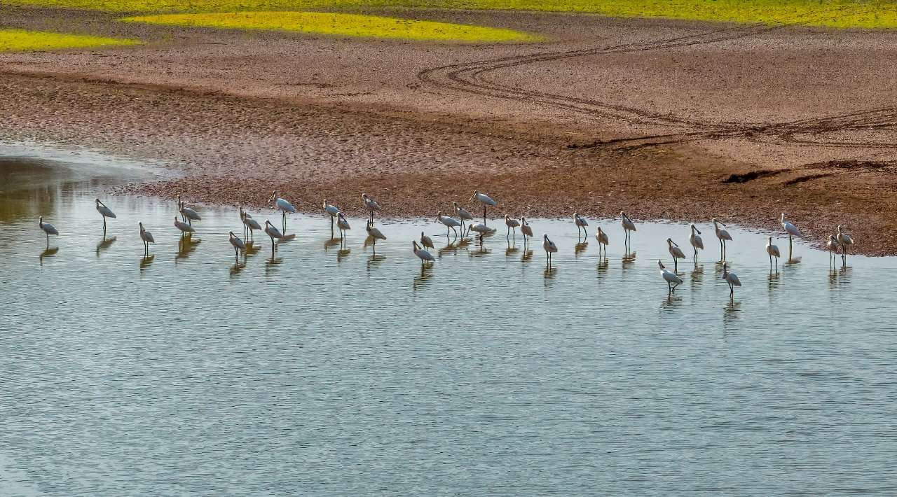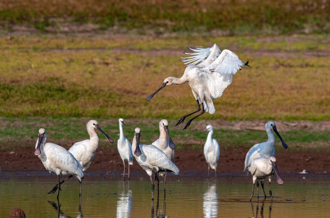 据了解,白琵鹭数量共有36只,它们有着黑色的长嘴,嘴端上下扁平,与中国传统乐器中的琵琶极为相似,脚长为黑色,通身羽毛为白色。只见它们时而沿着浅滩悠闲地寻找食物,时而展翅翱翔,时而又停下来梳理身上的羽毛,优雅的身姿倒映在水面上,让波光粼粼的水面更为灵动。