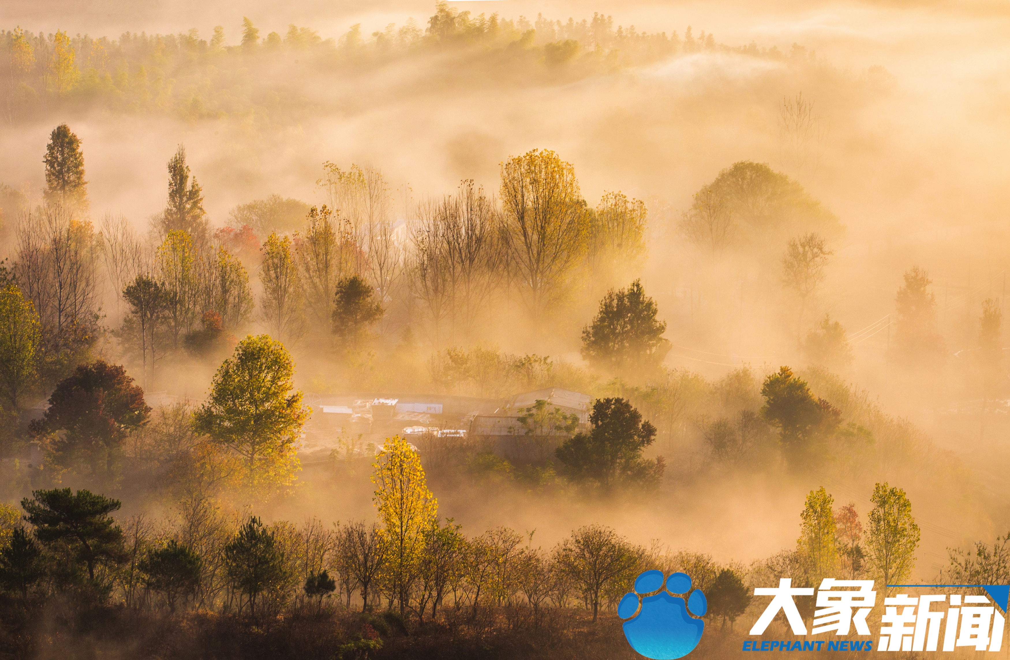 这里的秋日,无南国之喧哗,亦不似北国之萧瑟,苍松墨绿、丹枫染红,山间黄、红、绿相间的颜色争先恐后地渲染着,崇山峻岭在晨曦薄雾中若隐若现。