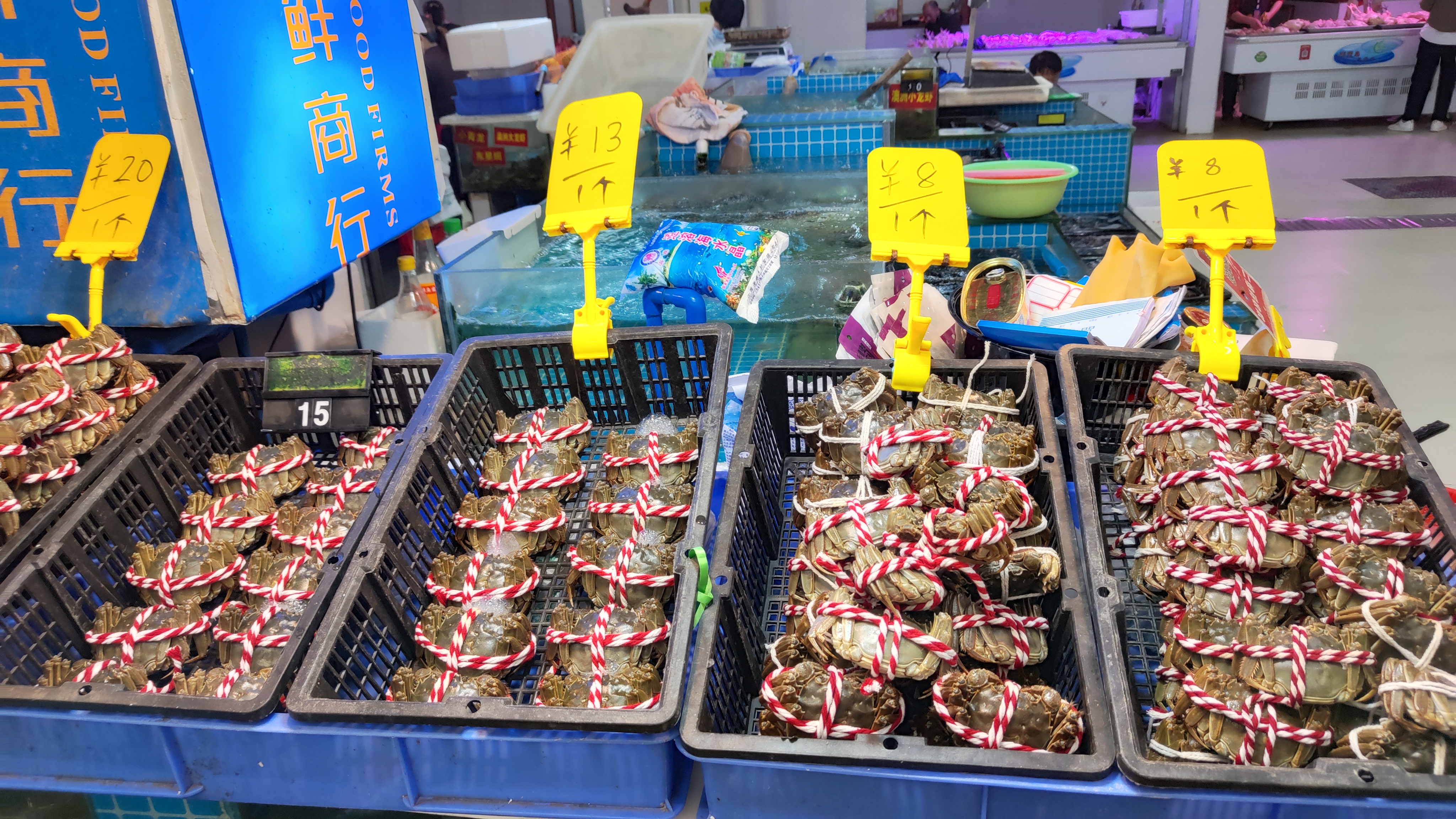 “螃蟹什么价?”“三只、五只、十只”……伴随着普通大闸蟹的降价,水产市场内迎来购买高峰,很多市民前来购买大闸蟹。市民刘女士表示,今早一口气买了八只大闸蟹,总共160元,价格很划算。