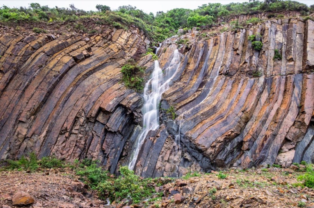 香港万宜水库东坝,受地质运动影响弯曲变形的岩柱,中间还有一道后期侵入的玄武岩质岩墙