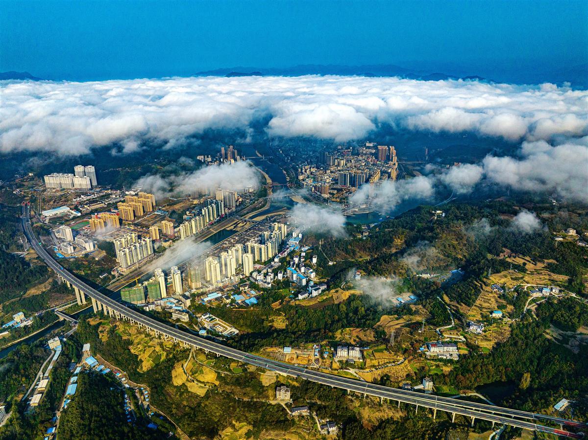 10月23日,襄天高速竹山县城关镇霍山坡高架桥在晨雾中延伸,美丽壮观。