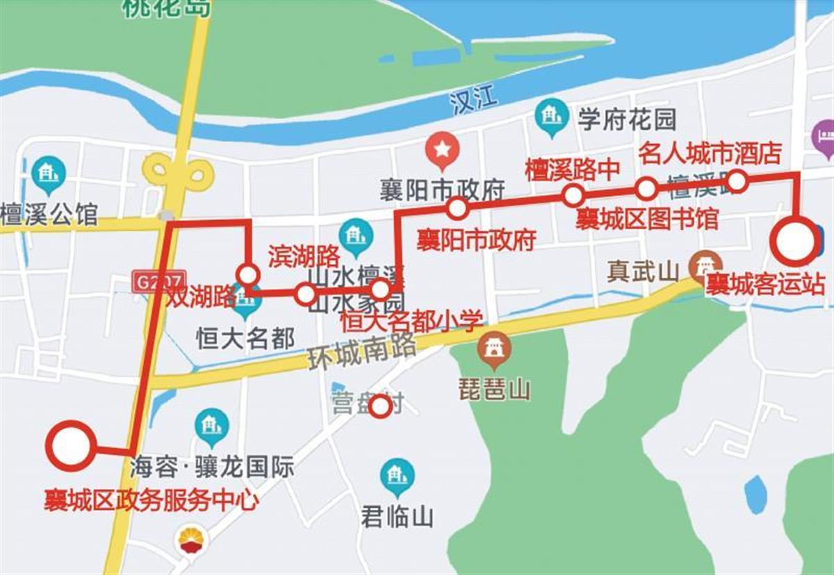 沿途停靠站点:襄城客运站、名人城市酒店、襄城区图书馆、檀溪路中、襄阳市政府、恒大名都小学、滨湖路、双湖路、襄城区政务服务中心。襄城客运站发车首末班时间分别为7:40、18:00,襄城区政务服务中心发车首末班时间分别为8:08、18:25,线路往返运营。