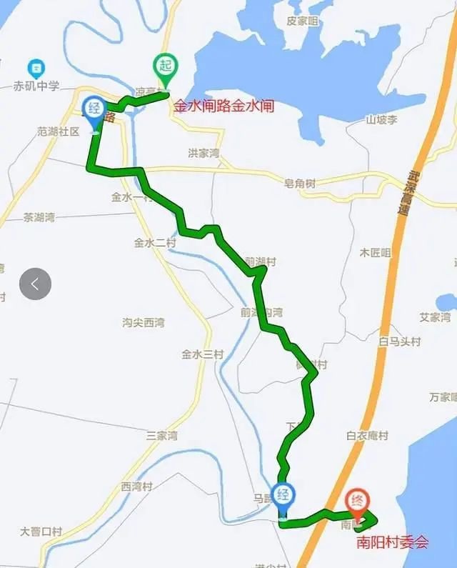 停靠站点:金水闸路金水闸、金水闸路金亭路、金康北路民主巷、金康南路金水学校、金水一村、何家湾、金水子弟学校、长安垅、侯家湾、彭家老屋、铁锦村委会郭家新屋、贺岭小学、前湖村委会、上吴刘、谭家咀湾、马蹄口村委会、洪家老屋、祖堂岭湾、南阳村委会。(沿途设置站点19个)