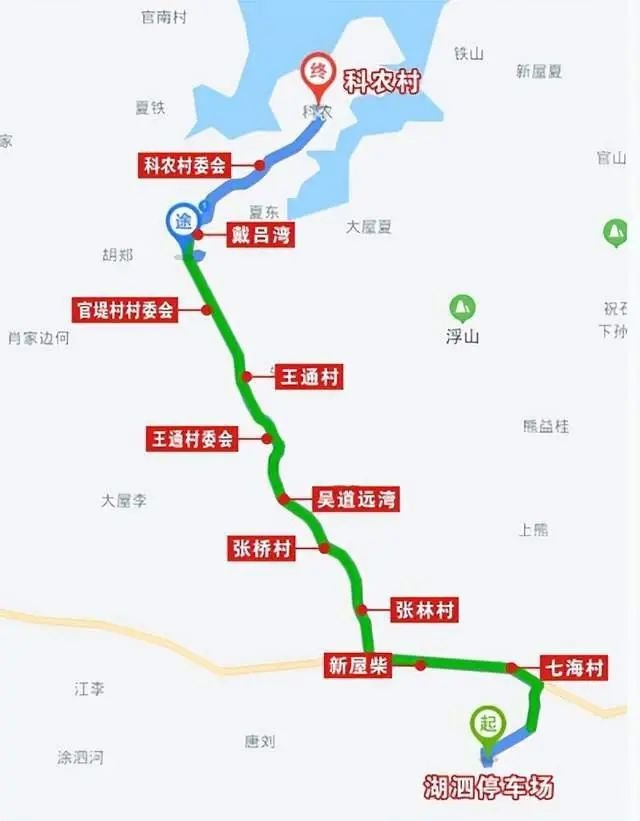 停靠站点:湖泗街停车场、七海村、新屋柴、张林村、张桥村、吴道远湾、王通村委会、王通村、官堤村委会、戴吕湾、科农村委会、科农村。