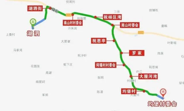 停靠站点:湖泗街停车场、湖泗街、株山村委会、祝杨区湾、南山村委会、祝思亭、罗家、何堰村委会、大屋河湾、均堡村、均堡村委会。