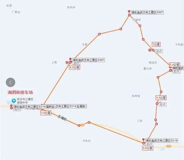 线路走向:湖泗街停车场、铁贺线、双熊线、海洋村、安洋路、湖舒线、铁贺线、湖泗街停车场。