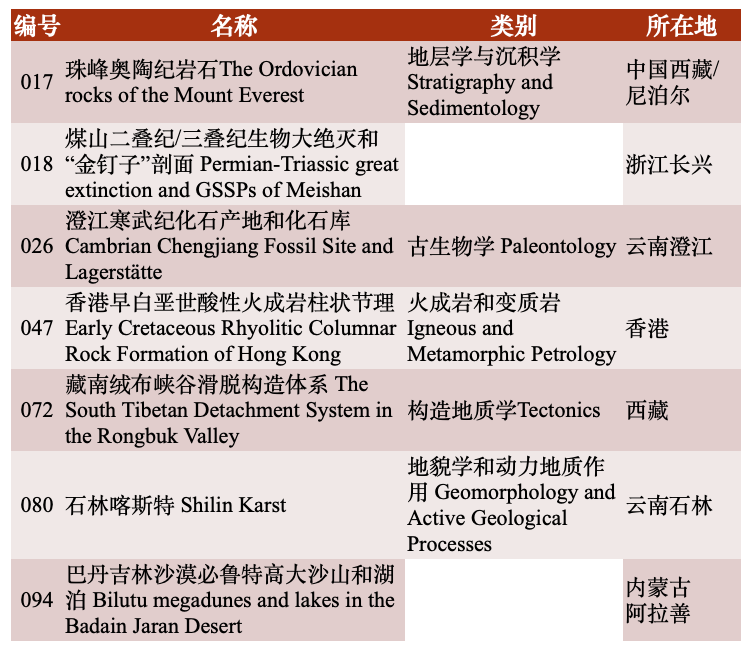 10月26日,“国际地质科学联合会首批100个地质遗产地”新闻发布会在浙江长兴举办,国家级地质遗迹保护区长兴煤山二叠纪/三叠纪生物大灭绝和“金钉子”,世界地质公园内蒙古巴丹吉林沙漠必鲁特高大沙山和湖泊、香港早白垩世酸性火成岩柱状节理、云南石林喀斯特,世界自然遗产地和国家地质公园云南澄江寒武纪化石产地和化石库、藏南绒布峡谷滑脱构造体系、珠峰奥陶纪岩石(中国/尼泊尔)7个中国地质遗产地成功入选。这些遗产地涵盖岩石学、构造地质学、地层古生物学、地理学、地貌学等领域,中国因此成为全球首批中获得地质遗产地最多的国家之一。