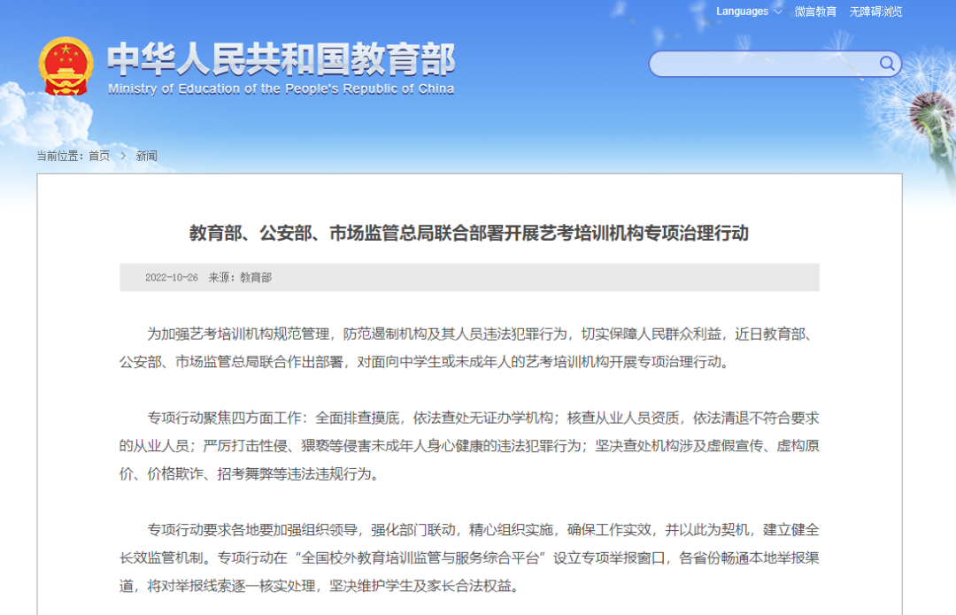 据教育部消息,为加强艺考培训机构规范管理,防范遏制机构及其人员违法犯罪行为,切实保障人民群众利益,近日教育部、公安部、市场监管总局联合作出部署,对面向中学生或未成年人的艺考培训机构开展专项治理行动。