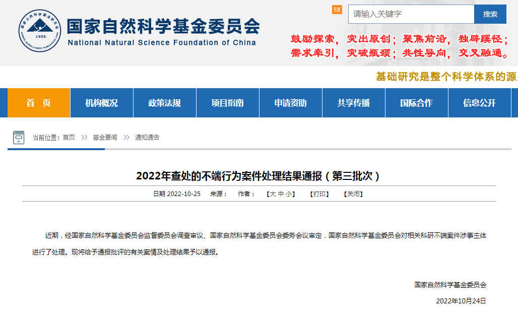 10月25日,国家自然科学基金委员会网站发布2022年查处的不端行为案件处理结果通报(第三批次)。