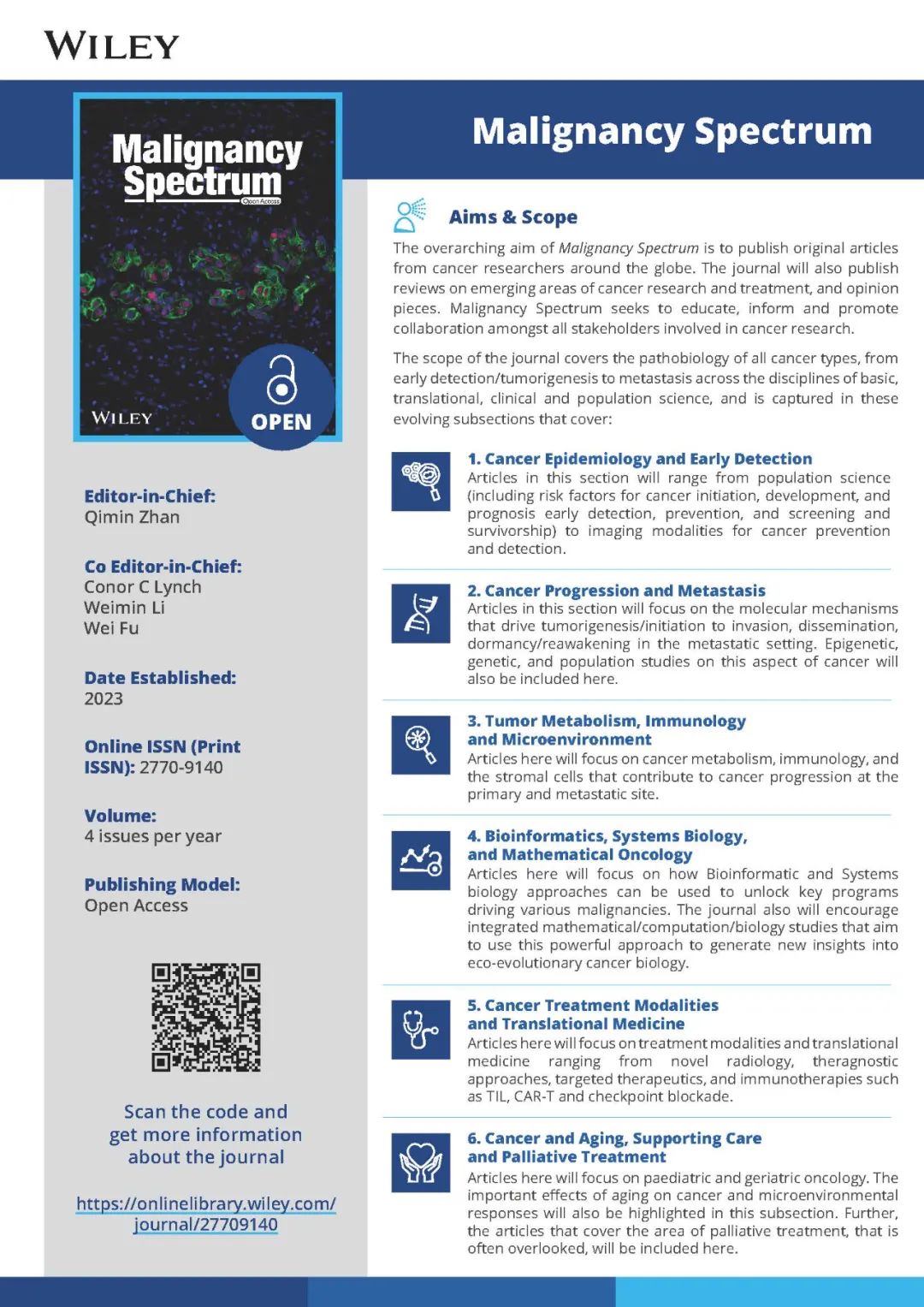 Malignancy Spectrum(《肿瘤学全景》)是由高等教育出版社主办的全新英文期刊,着眼于肿瘤学领域的全学科建设,聚焦肿瘤科学领域的重大热点问题,注重肿瘤学与相关学科的交叉融合发展。主编詹启敏院士是国际知名肿瘤学专家,长期致力于肿瘤分子生物学和肿瘤转化医学研究。