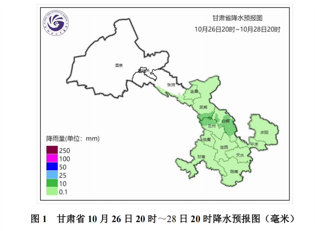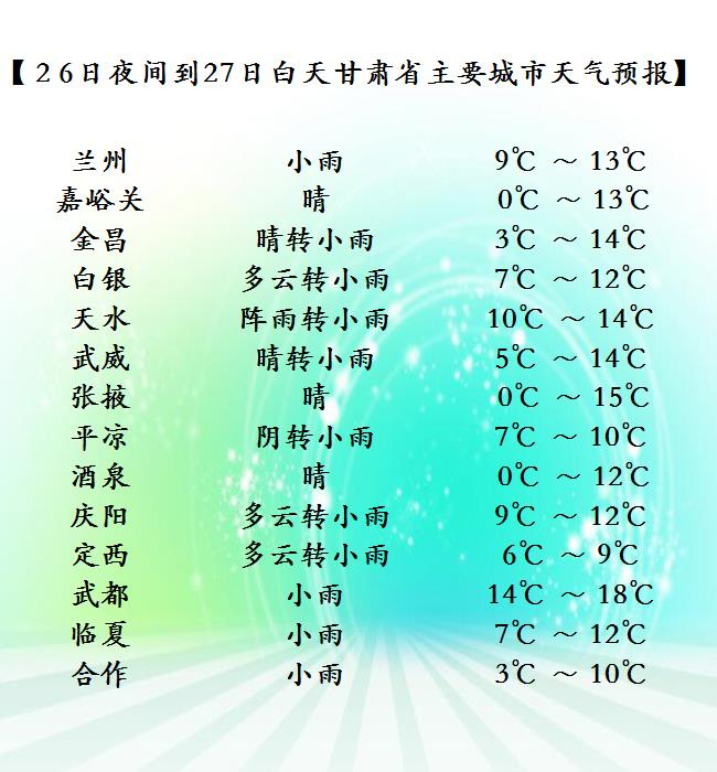 10月26日夜间至10月28日白天,武威、白银、陇南、天水、平凉、庆阳等市多云转阴有小雨,其中武威市南部、白银市部分地方有中雨;兰州、定西、 临夏、甘南等市州多云转阴,部分地方有小雨(雪)或雨夹雪。降水过程最大累积雨量在5至15毫米之间。