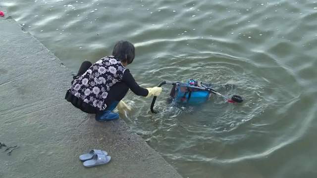 这位大妈自带洗发液在河里洗头,这是公共地方,请回你家的浴室洗吧!