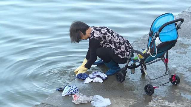这位大妈无视河边的警示牌,若无其事地在河岸边清洗衣物还有婴儿车,这样做不仅对河流水质造成污染,还存在安全隐患。