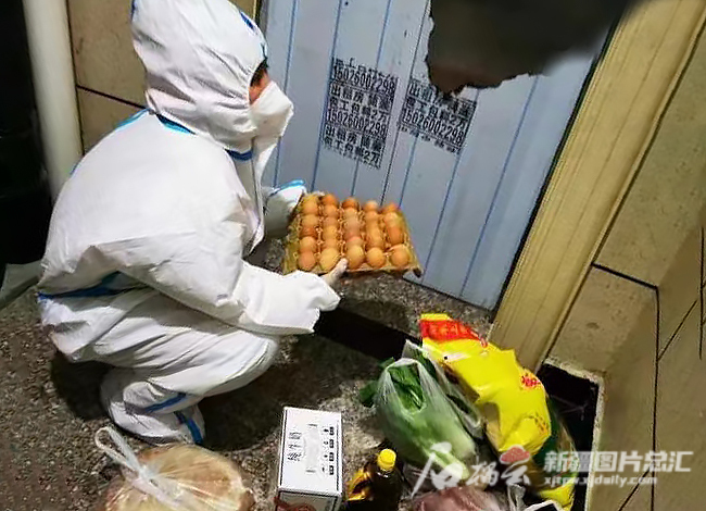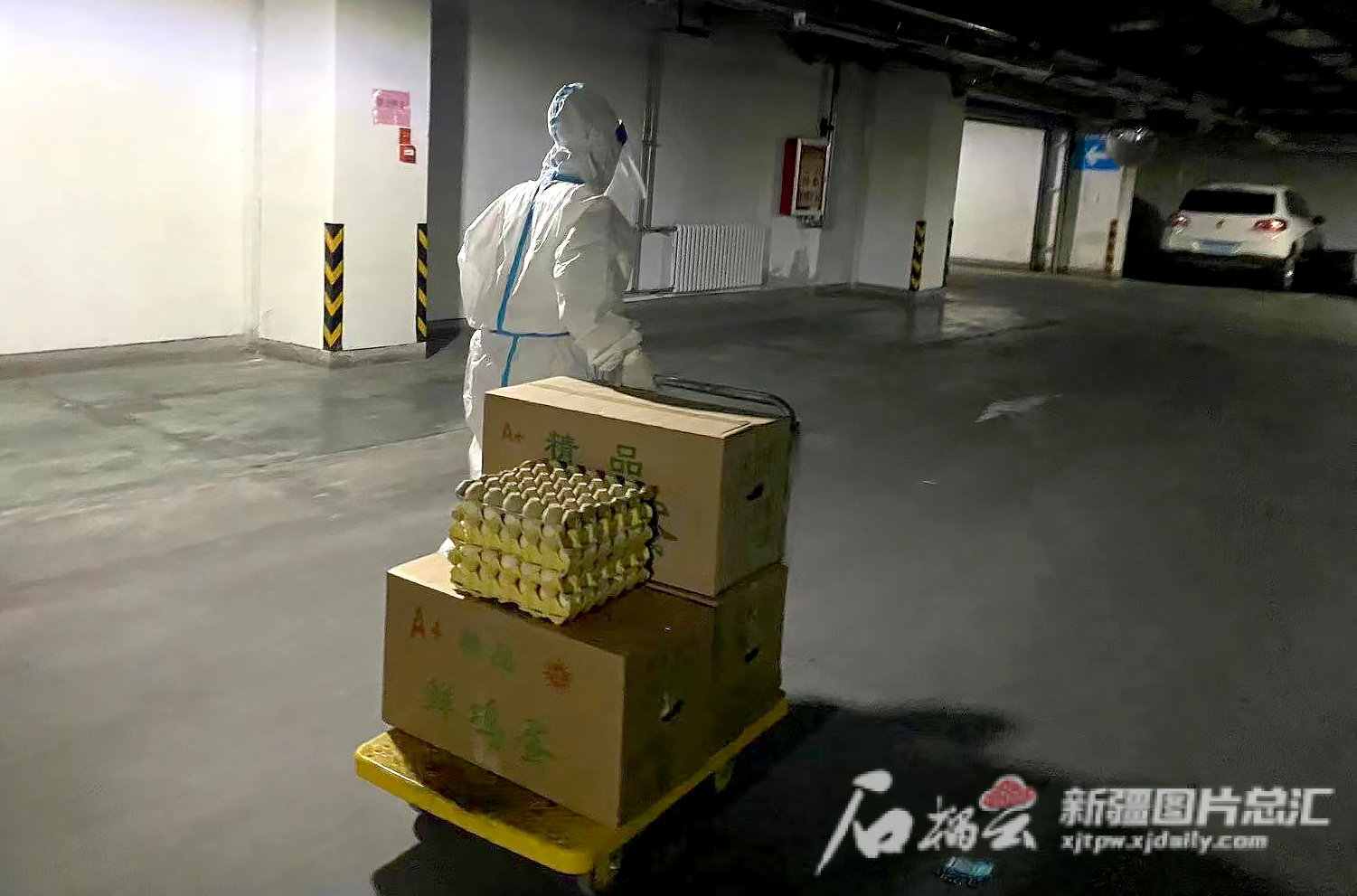 10月24日20时,乌鲁木齐经济技术开发区(头屯河区)九华山街社区工作人员努克孜·克日木为中城国际城小区居民送鸡蛋。她负责小区235户、580名居民的物资配送工作,每次仅蔬菜包就要送200包左右。通讯员 张璐摄