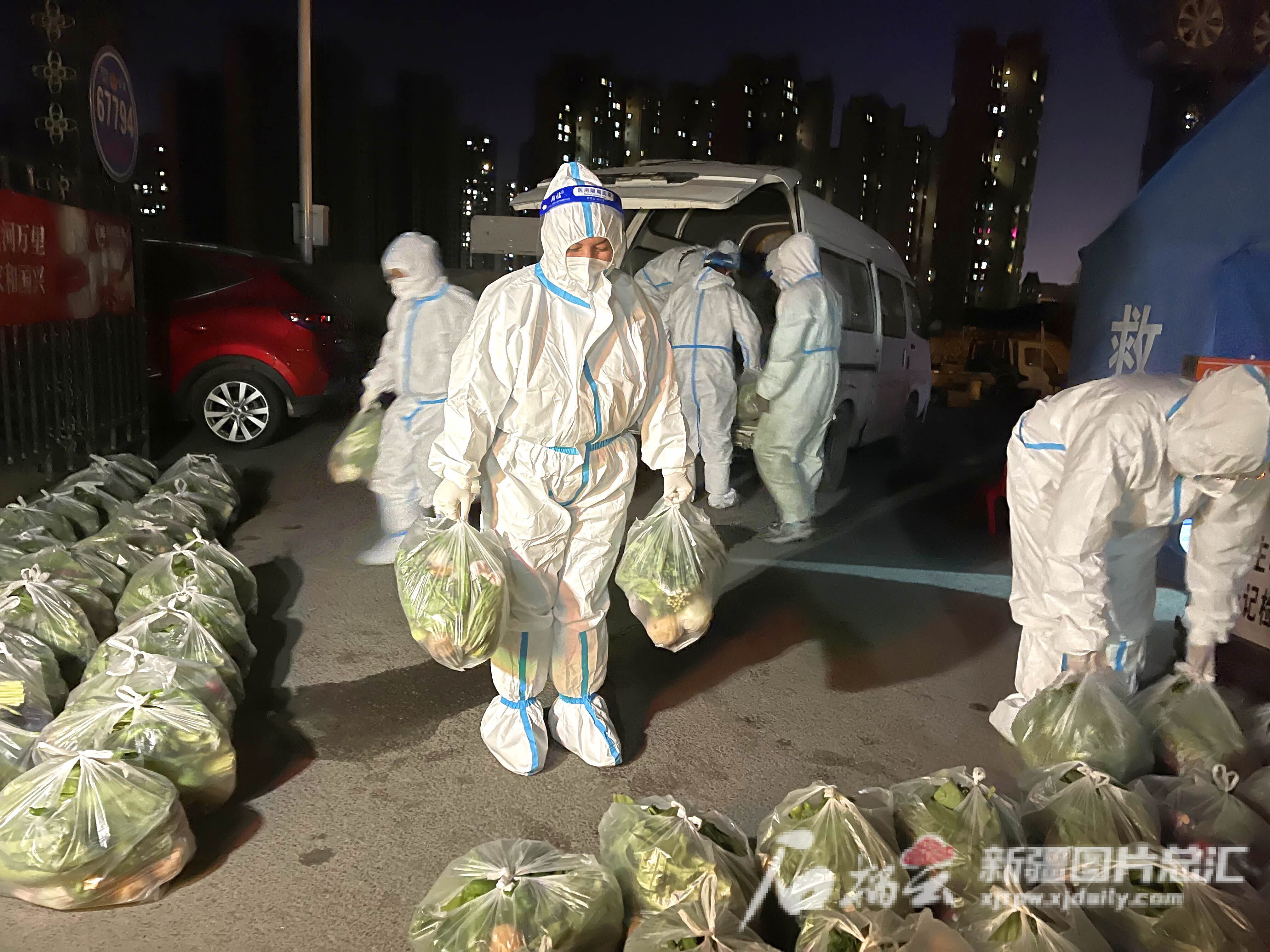 10月22日22时,在力鼎新城西区大门口,乌鲁木齐经济技术开发区(头屯河区)东山坡社区工作人员再努热·吾普尔带领志愿者在给居民配送蔬菜包。通讯员 刘超楠摄
