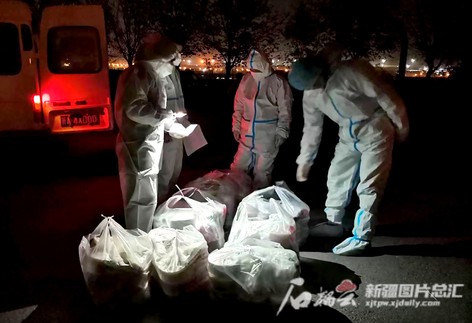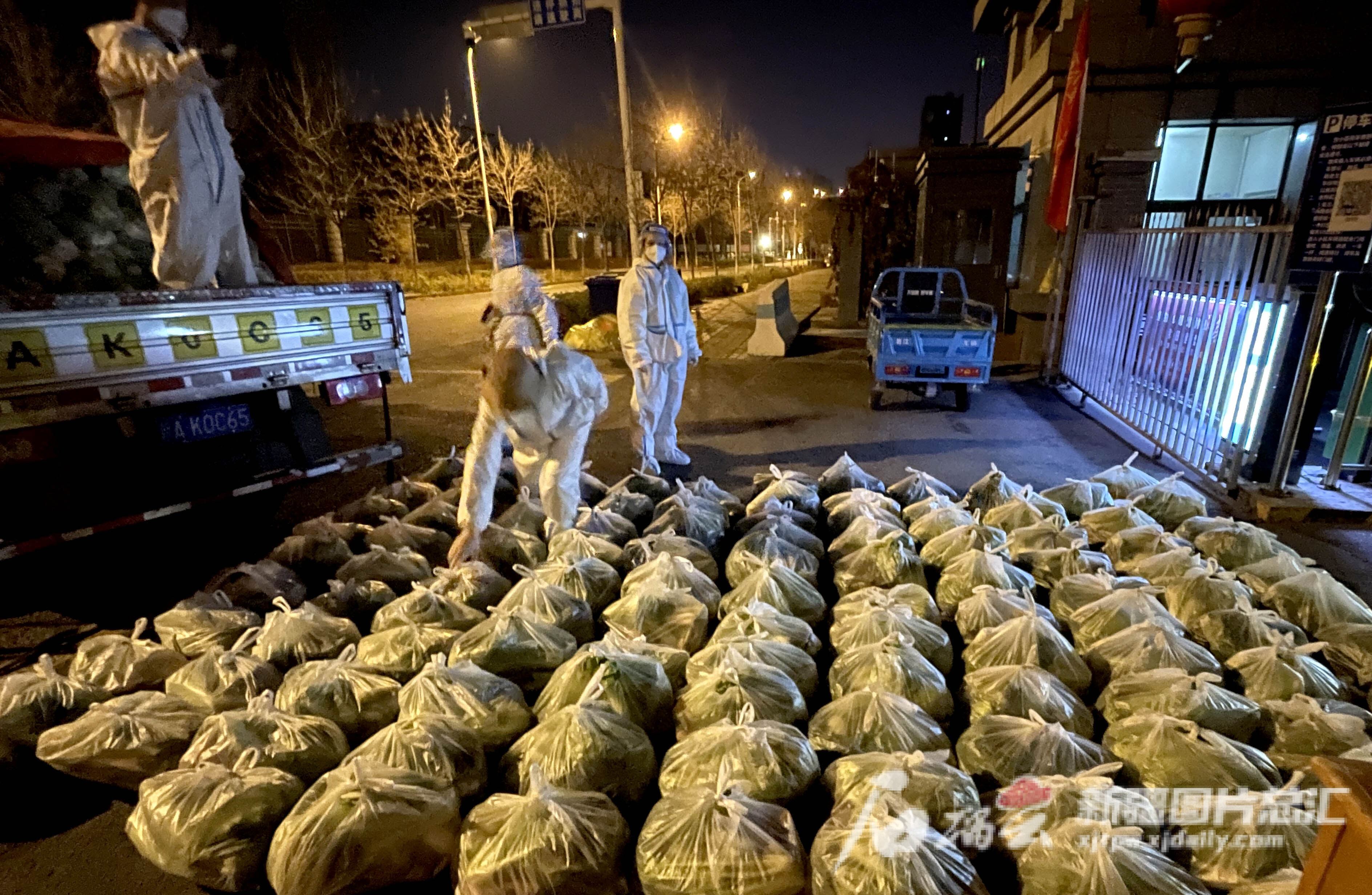 10月23日22时,在德泽园一区大门口,乌鲁木齐经济技术开发区(头屯河区)绿谷社区工作人员及“访惠聚”工作队队员卸下237个蔬菜包,消杀静置半小时后再分送到居民家中。通讯员 马倩摄