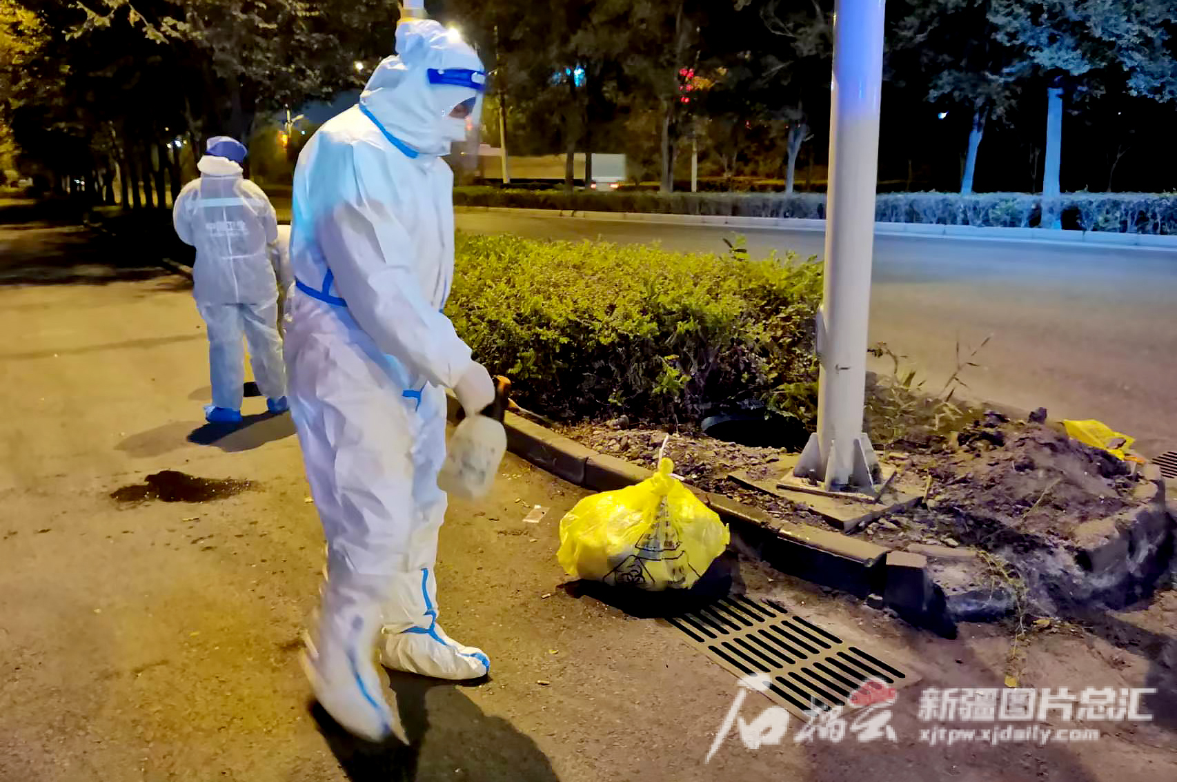 10月20日22时,乌鲁木齐经济技术开发区(头屯河区)新园社区副主任马骁东在青缘小区门口对刚刚使用过的医疗物资进行消杀。通讯员 热孜亚·阿布都克来木摄