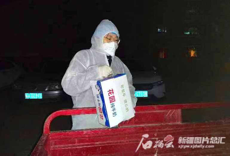 10月24日23时,夜色中,乌鲁木齐经济技术开发区(头屯河区)百园社区工作人员徐会艳在给团缘小区居民送牛奶。通讯员 秦昕瑶摄