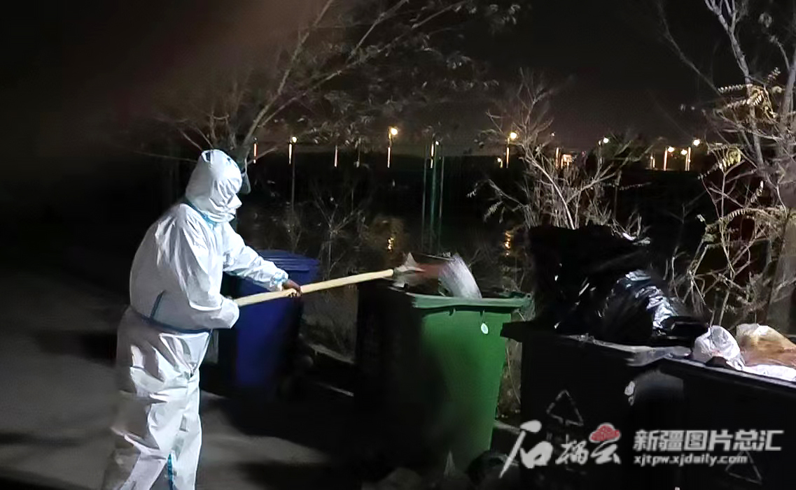 10月23日22时30分,乌鲁木齐经济技术开发区(头屯河区)百园社区团缘小区里,新疆富通阳光物业经理艾克拜尔·阿依甫在整理垃圾箱,以便垃圾转运车清运。通讯员 秦昕瑶摄