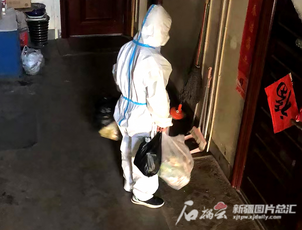 10月24日23时许,在乌鲁木齐市水磨沟区新民路街道红塔社区三运司家属院,社区工作人员马俊梅在给居民派送物资。通讯员 李红梅摄