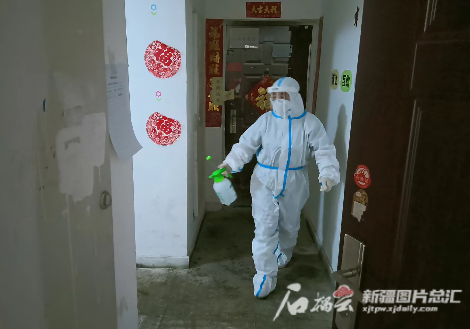 10月25日20时,乌鲁木齐经济技术开发区(头屯河区)沟西路社区干部冯玉雯在对十四街小区东区居民楼楼道和电梯间进行消杀。吴雷雷 摄