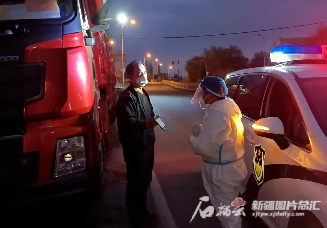 10月25日20时,乌鲁木齐经济技术开发区(头屯河区)友好利通停车场,王家沟新园社区工作人员在引导大货车及司机有序通行。通讯员 王佳摄