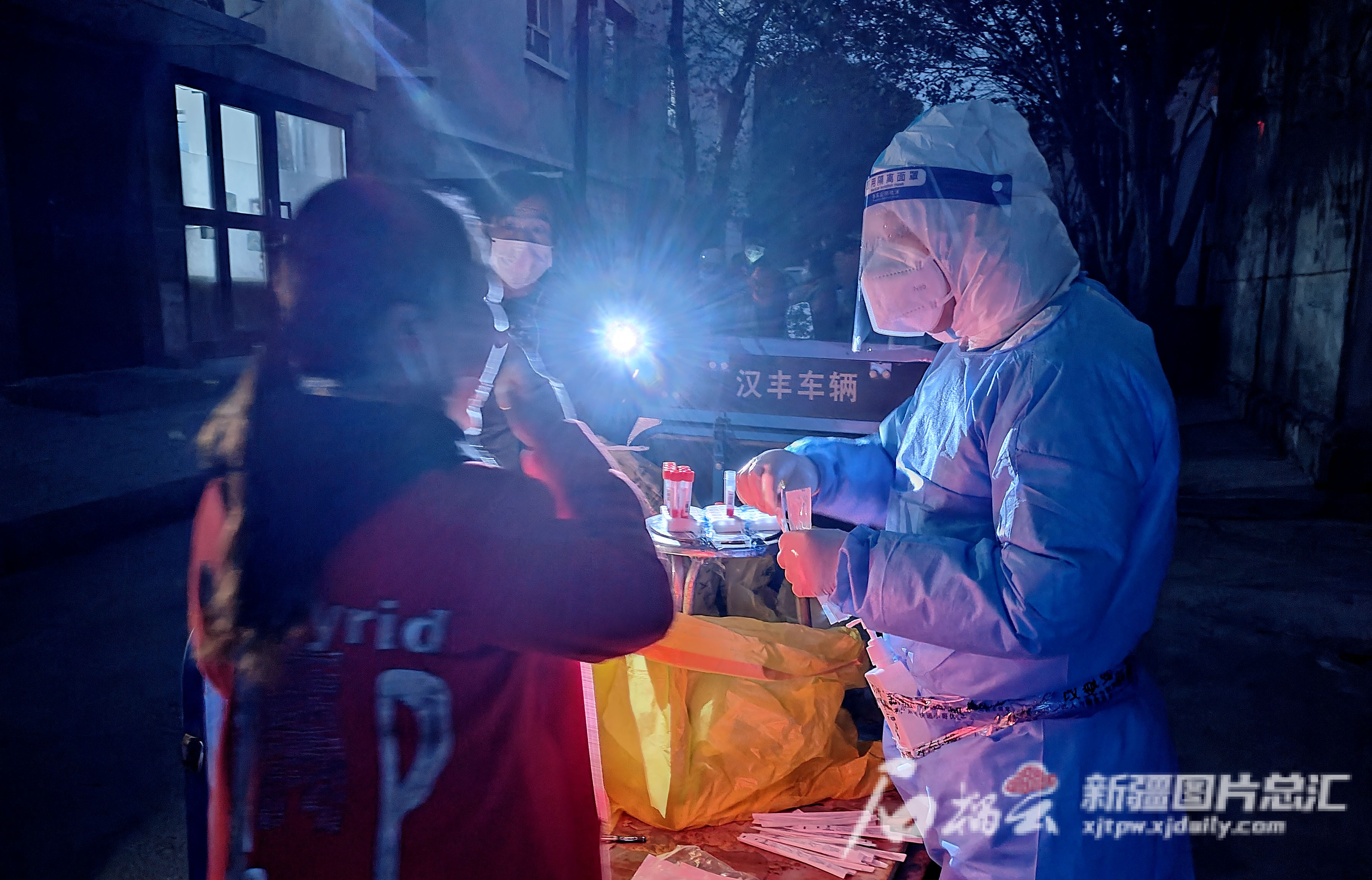 10月23日23时许,在乌鲁木齐市水磨沟区新民路街道红塔社区荣业小区,社区工作人员在为居民采集核酸。通讯员 李红梅摄