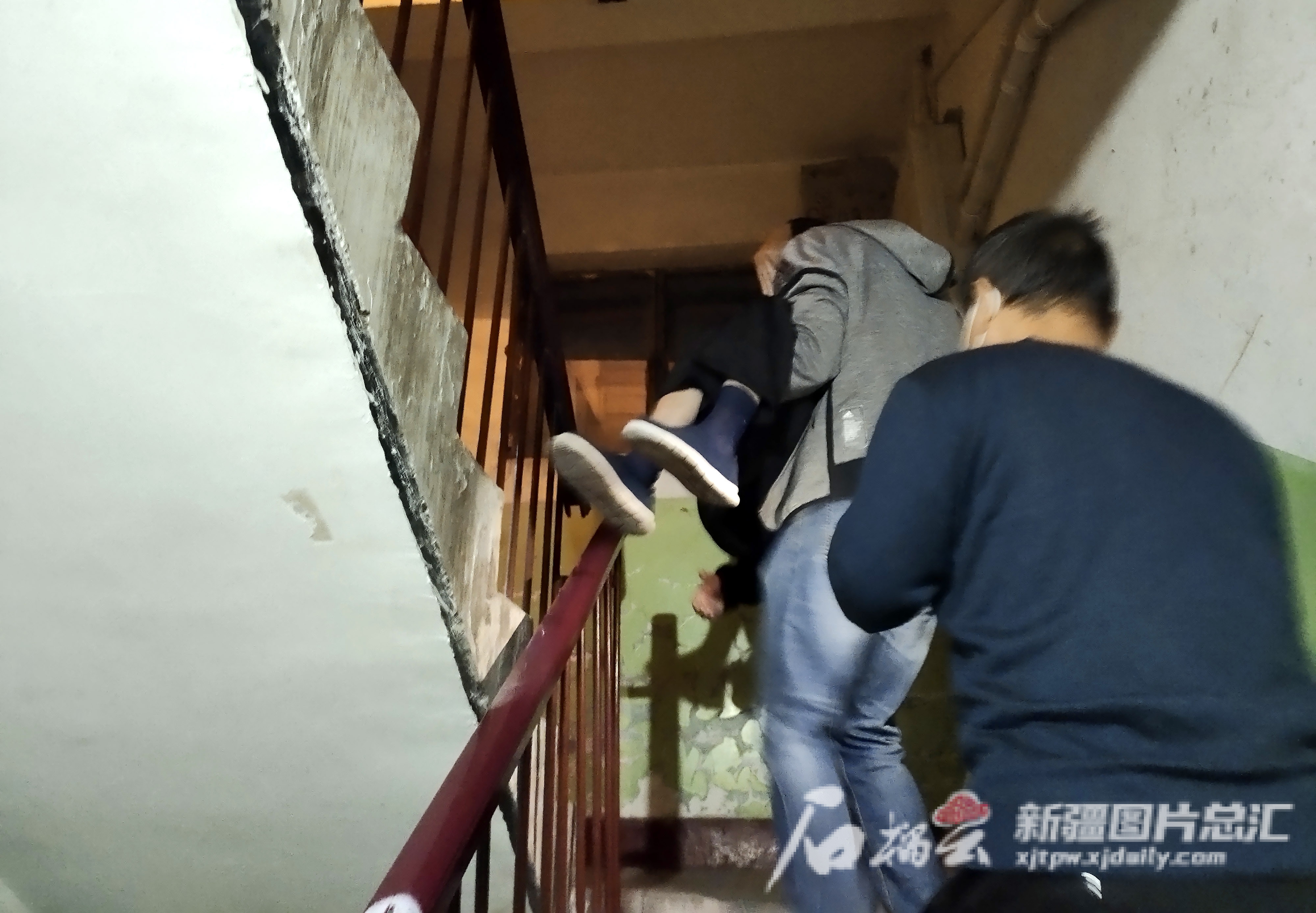 10月23日20时许,乌鲁木齐市米东区南路街道金安社区金安雅居小区,志愿者李丛明将一名患有肺部疾病的老人抱上三楼的家中。通讯员 马洁摄