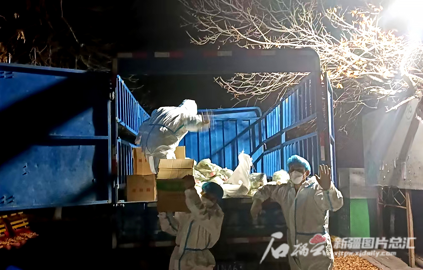 10月21日22时许,乌鲁木齐经济技术开发区(头屯河区)新园社区,4名党员突击队员在辖区器材库小区卸载面粉25袋、清油8箱、菜包50包,并配送到居民家中。通讯员 王佳摄