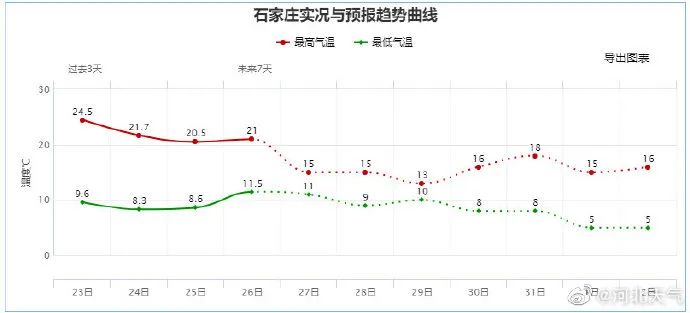 秋冬交替时节,冷空气也变得活跃起来。受其影响,明天大部气温骤降,中南部最高气温将掉回“1”字头。而最低气温也将应声而落,预计明天早晨,保定、廊坊以北地区和衡水、邢台、邯郸最低气温下降3~5℃,局地下降6~8℃。