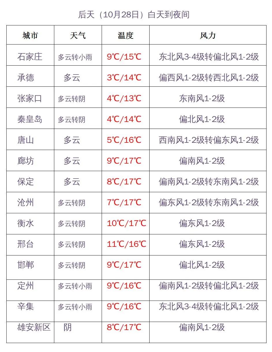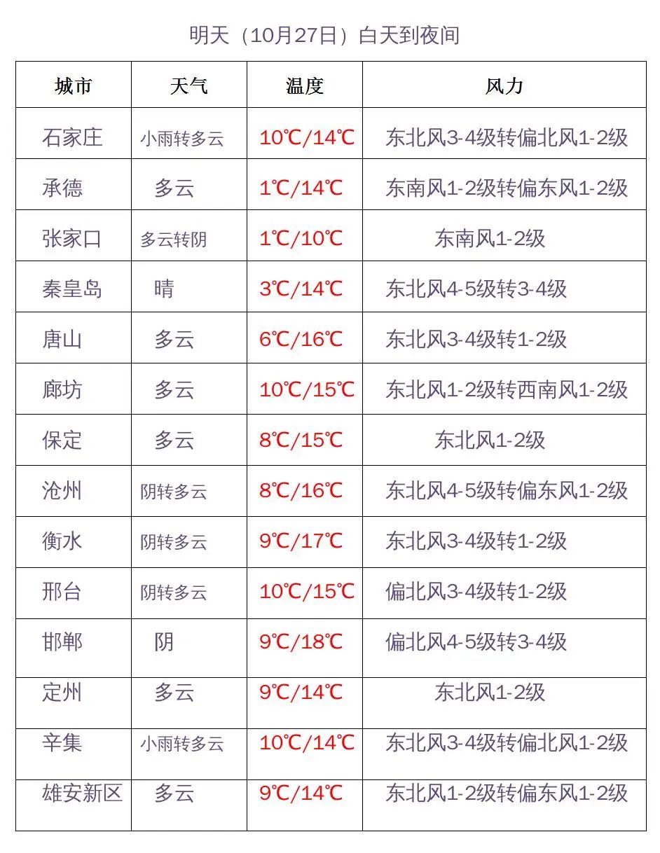 明天白天,石家庄西部、邢台西部阴有小雨或零星小雨,其他地区多云。最高温度,张家口、承德、保定西北部9~12℃,其他地区13~19℃。