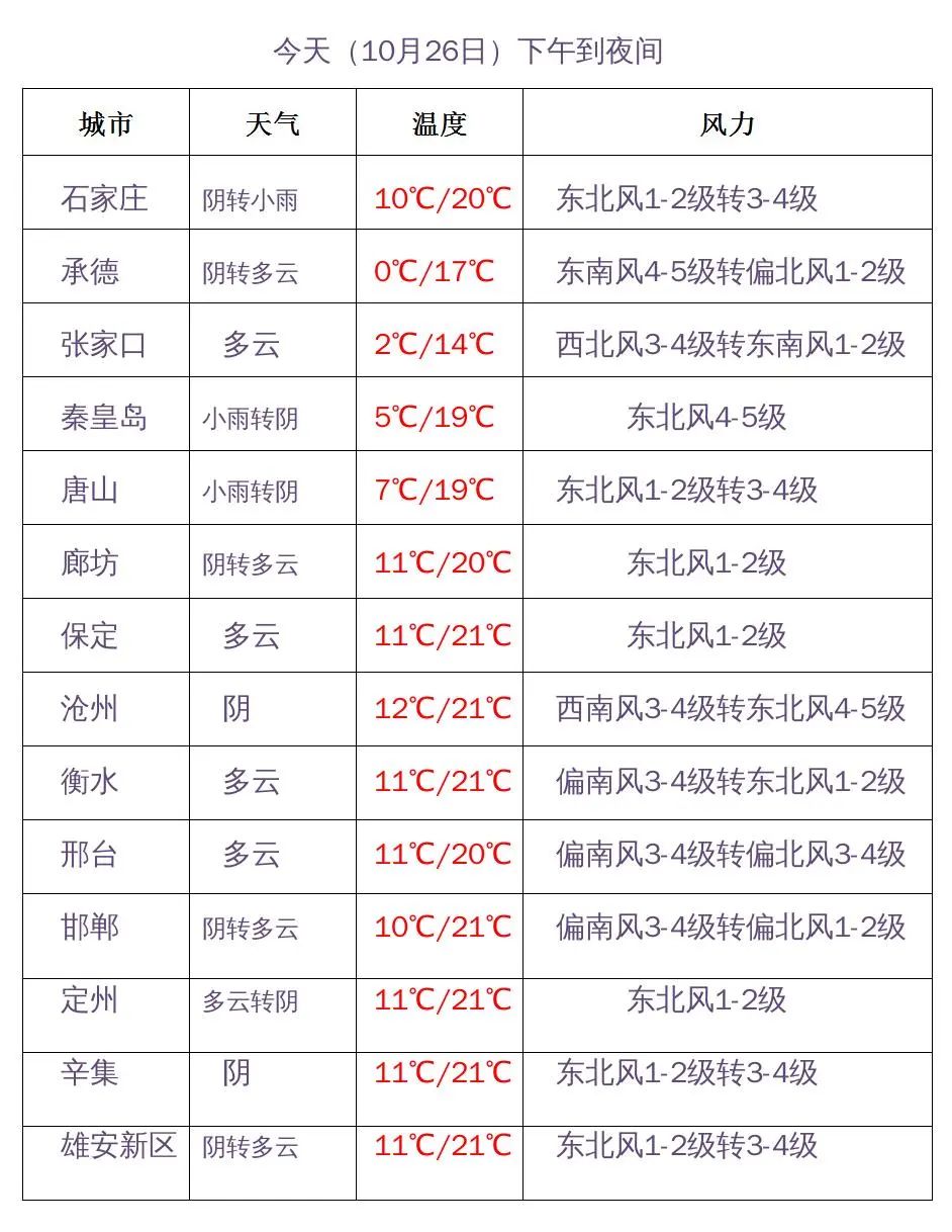 今天傍晚到夜间,唐山中北部、秦皇岛、保定西部、石家庄西部阴有小雨或零星小雨,其他地区多云。最低温度,张家口、承德、保定西北部-9~4℃,其他地区5~12℃。
